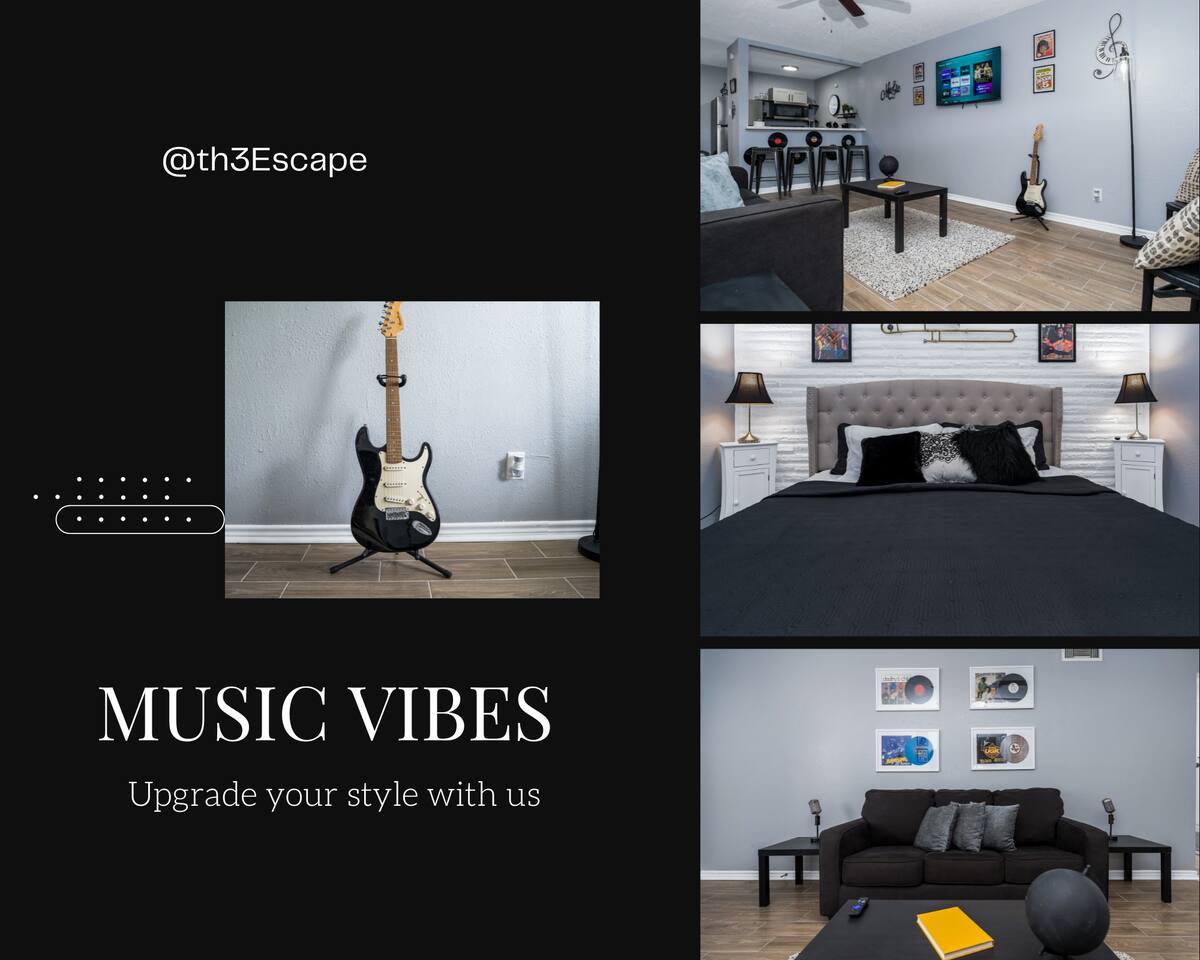 Find serenity within The Music Room at The Escape, a boutique hotel located in close proximity to downtown Houston. Crafted to embody the city's artistic spirit, it's a perfect retreat for those with a love for culture. Offering 8 unique rooms, each showcasing its own distinct character, we cater to solo travelers, couples, business guests, and those with medical requirements Work from Home! Monthly! Homecoming Afrotech Conference near NRG, Airport, TSU, UH Pet friendly!!!