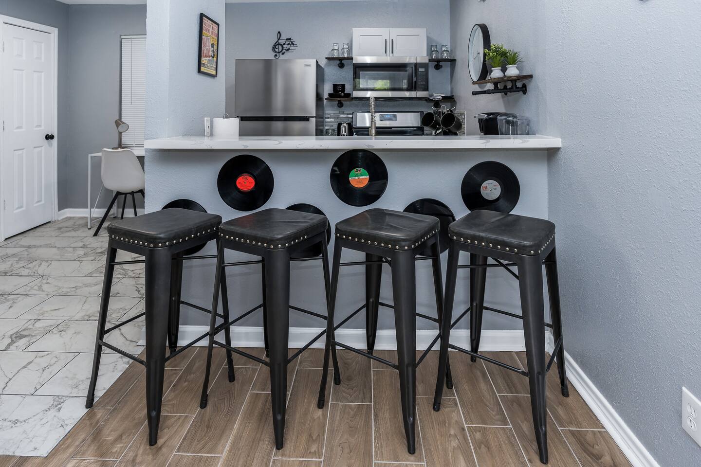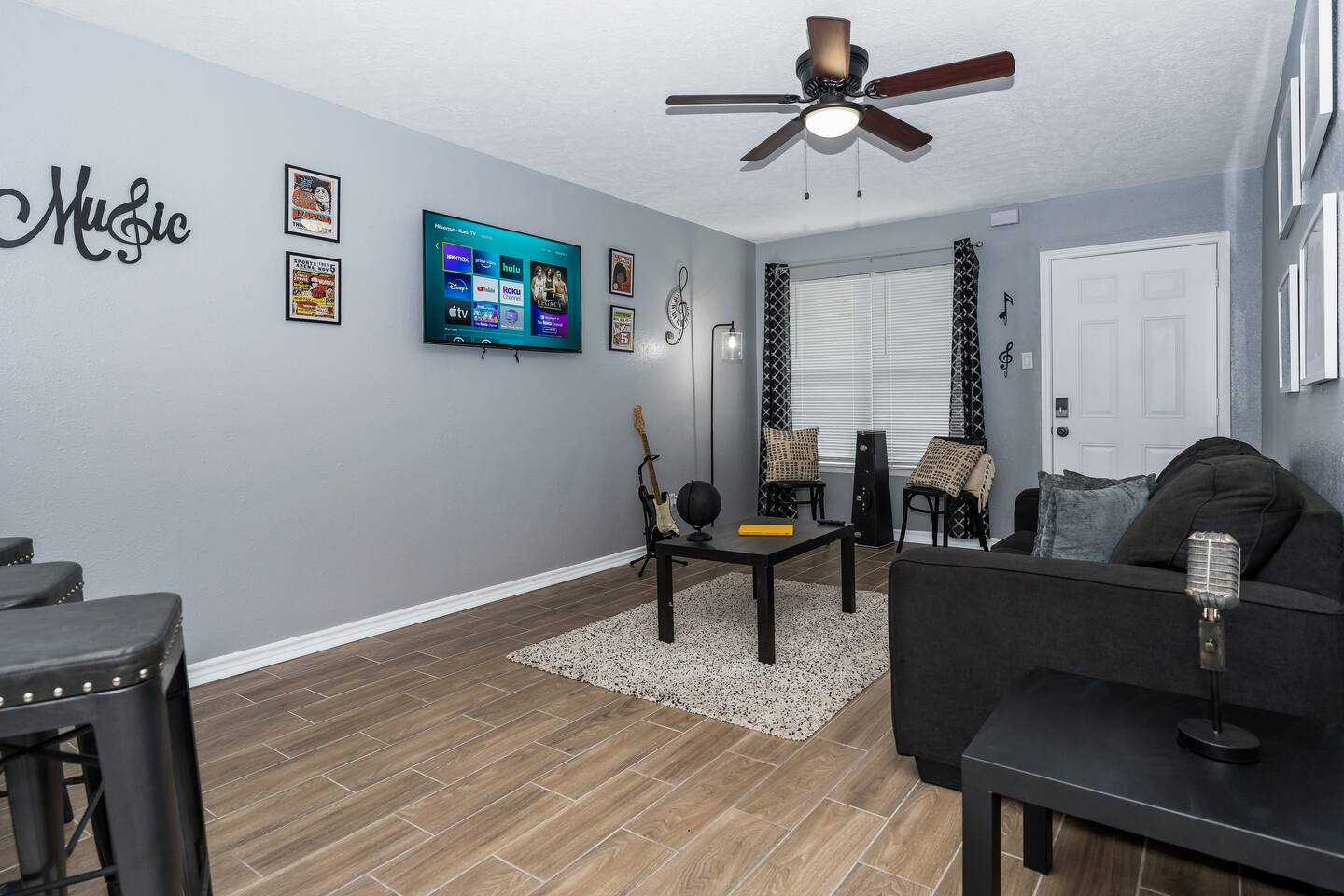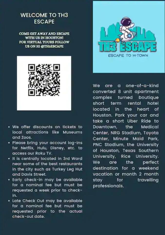 Stay in our charming Music Room, minutes from NRG, Med Ctr & Dwtn Houston. Enjoy a private room with a queen bed, vintage record player, shared living area, kitchen & modern bathroom. The Complex has pool & laundry facilities. Close to major highways & public transit. Complimentary coffee/tea, Wi-Fi & local tips are provided. Book now for a cozy and memorable Houston stay! Get a sneak peek of The Escape and its rooms on IG at @Th3escape. We are a quick ride from the bustling downtown area, the Museum District, Medical Center, and various parks and sporting arenas. ✰Perfect for Solo travelers, Couples, Businesses, and Medical Professionals ✰ Under 10 min ride to Downtown, Museum District, Medical Center, parks, and sporting arenas ✰4K Smart TV – Roku, Netflix ✰Business: Work Desk, 300 MBPS Wifi ✰ Keurig Coffee Provided ✰100% Smoke-free ✰Easy Access to Hwy 288,59,45 | 1/2 mile away Travel with friends/family and rent multiple units *PET Friendly --MUST BE PRE-APPROVED * $20 per pet/per night fee - no more than 2 pets at one time allowed →Sleeps 3 Comfortably →1 King Bed - Sleeps 2 →1 sofa - Sleeps 1 →NEST A/C Wall unit + Central Heat →2 Smart TVs - one in each room →Workspace provided for the working professional CLEANLINESS is a high priority for our listing! There is always a professional, thorough, and sanitizing cleaning between guests. LOCATIONS TO NOTE: ☞Texas Medical Center 9 min | 3.7 miles ☞Museum District and Zoo 8 min | 2.2 miles ☞Downtown 8 min | 2.4 miles ☞Toyota Center 7 min | 1.9 miles ☞EADO 6 min | 1.9 miles ☞PNC Soccer Stadium 6 min | 2.1 miles ☞Galleria Mall 12 min | 7.1 miles ☞Discovery Green 7 min | 2.0 miles ☞George R Brown Convention Center 7 min | 2.0 miles ☞Reliant Stadium 9 min | 6.6 miles ☞Minute Maid Park 7 min | 2.1 miles ☞ Emancipation Park 2 min | 0.3 miles ☞Hobby Airport 16 min | 9.6 miles Work from Home Afrotech Conference near NRG, Airport, TSU, UH